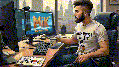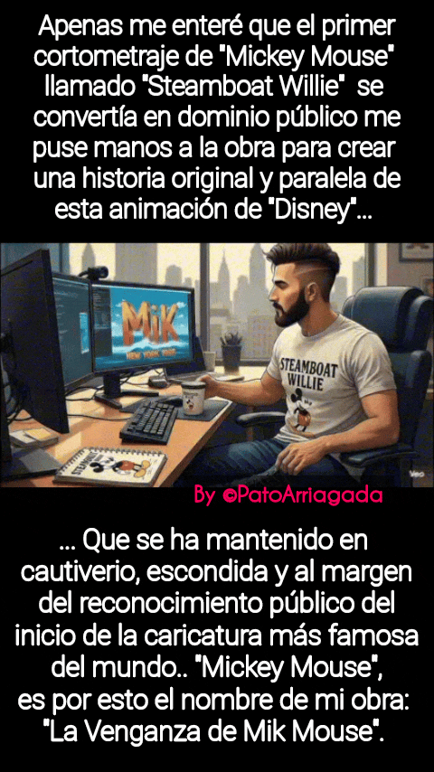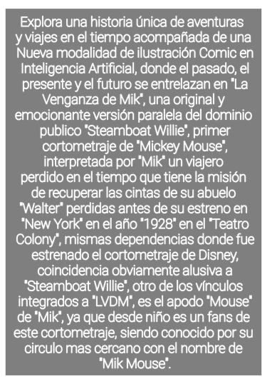 Una historia paralela y original del cortometraje de "Mickey Mouse" llamado "Steamboat Willie" que se convirtió en dominio publico el año 2024. La emocionante historia de este Cómic creado por ©PatoArriagada desde herramientas de Inteligencia Artificial mezcla viajes en el tiempo del personaje principal "Mik Mouse" en diversos formatos Multimedia.