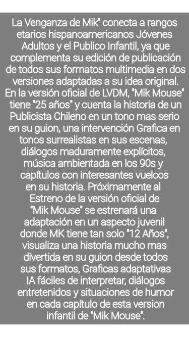 "La Venganza de Mik" original de PatoArriagada Publicista Digital IA en Neuromarketing. Todo el contenido multimedia de "LVDM" es elaborado con herramientas de Inteligencia Artificial. Para lograr equilibrio artificial y humano en el proceso y resultado final de "LVDM", su creador actuó como gestor principal en edición narrativa y escritura de Guion IA, técnicas ilustrativas en Grafica Digital IA, Edición y Producción Audiovisual IA, Diseño Web, Informática, Marca Digital Intelectual, Gestión Campaña Publicidad Digital IA de "LVDM".